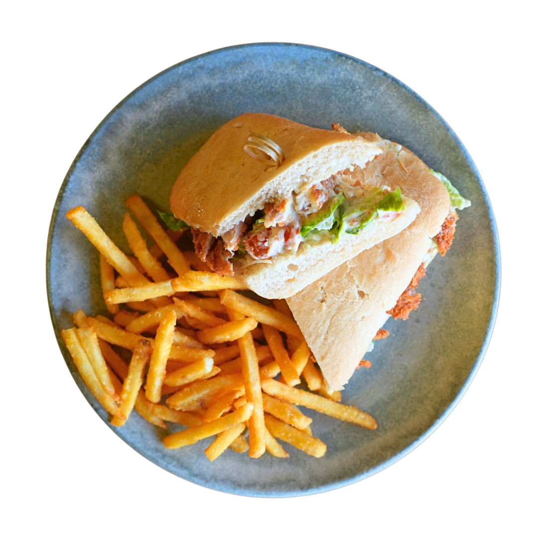 Crispy breaded chicken breast topped with crunchy romaine, parmesan shavings, and Caesar dressing, served on a toasted ciabatta.