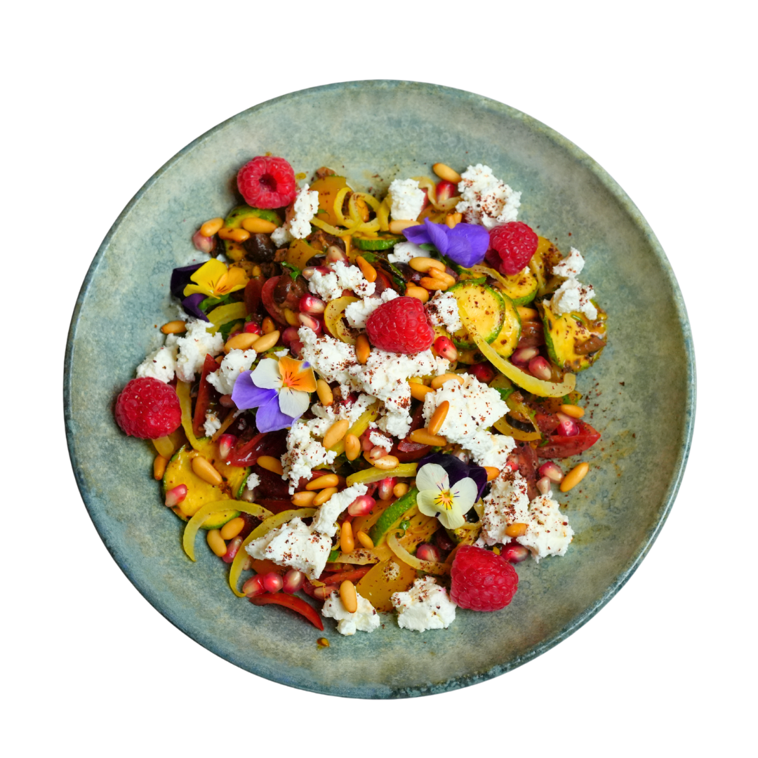 Zucchini with black olives, colorful cherry tomatoes, pomegranate seeds, raspberries, pine nuts, green onion and feta cheese finished with sumac, lemon zest and our secret sauce.