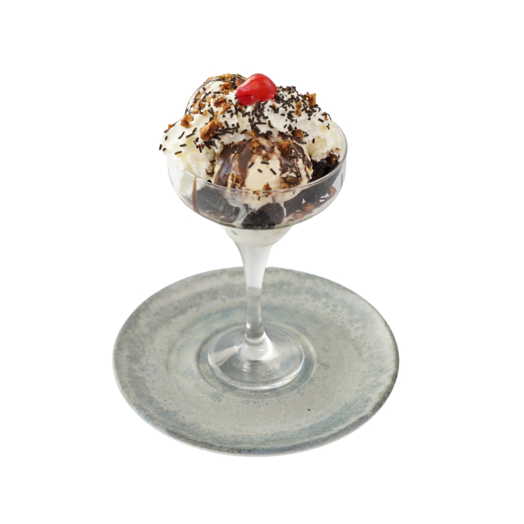 Home -made brownie topped with vanilla ice cream, whipped cream, chocolate vermicelli, and walnuts