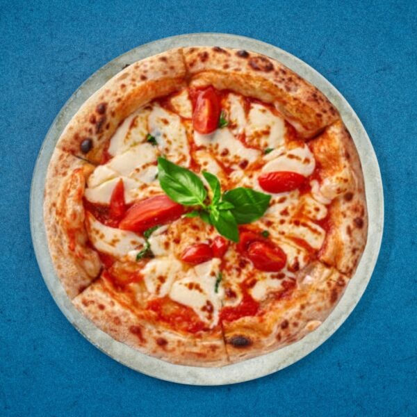 Classic Italian pizza with tomato sauce and fresh mozzarella cheese, topped with fresh basil leaves and cherry tomato